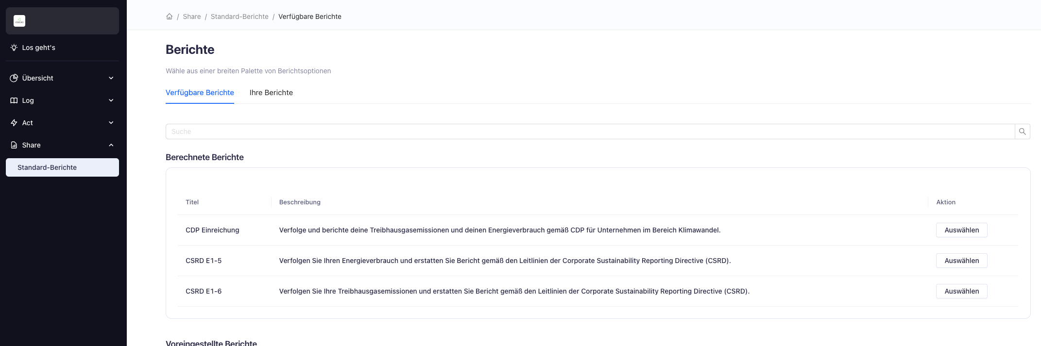 Entdecke vordefinierte Berichte, um tiefere Einblicke in deine Emissionsdaten zu erhalten: