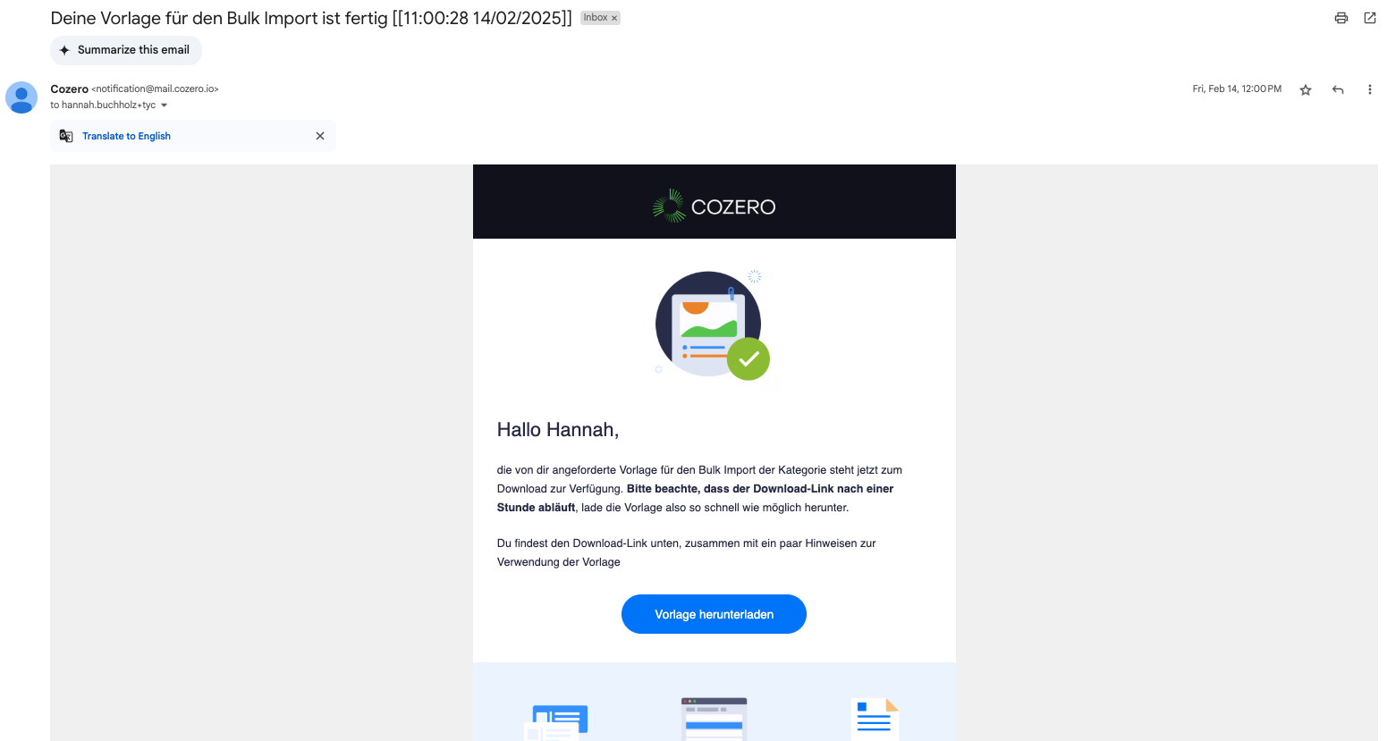 Wenn alle Daten importiert wurden, erhältst du eine Bestätigungs-E-Mail von Cozero.