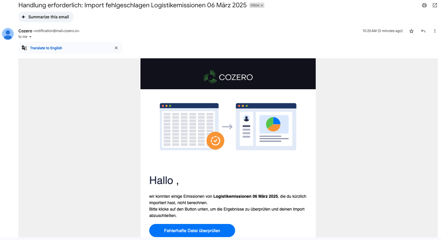 Deine Daten werden dann zur Berechnung der Emissionen an die EcoTransIT-Server gesendet. Es ist möglich, dass bei der Berechnung Fehler auftreten, z.B. wenn Start- oder Zielort nicht erkannt werden können. In diesem Fall erhältst du eine E-Mail mit einem CSV-Datei, die angibt, welche Zeilen Fehler aufweisen und was geändert werden muss. Zeilen, bei denen keine Fehler aufgetreten sind, werden bereits in dein Cozero-Konto hochgeladen. Um die Emissionen für die fehlerhaften Zeilen zu berechnen, korrigiere bitte die Aktivitätsdaten in einer neuen Vorlage für den Massenimport und lade diese zweite Datei in Cozero hoch, um deinen Import abzuschließen.