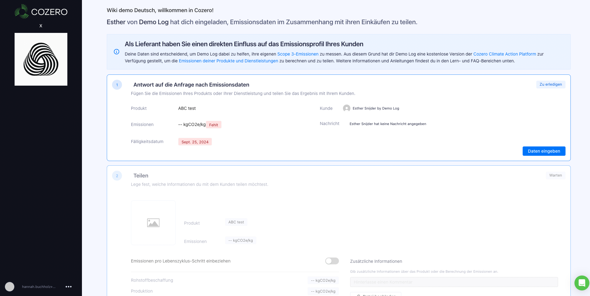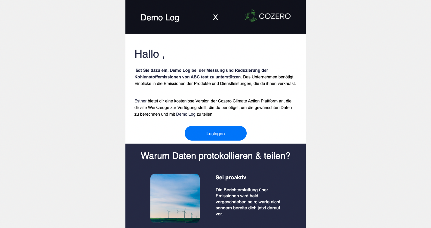 Ihr Kunde hat Sie eingeladen, auf eine kostenlose Version der Cozero Climate Action Plattform zuzugreifen. Klicken Sie auf den Button 'Loslegen' in der Einladungs-E-Mail, um zu beginnen.