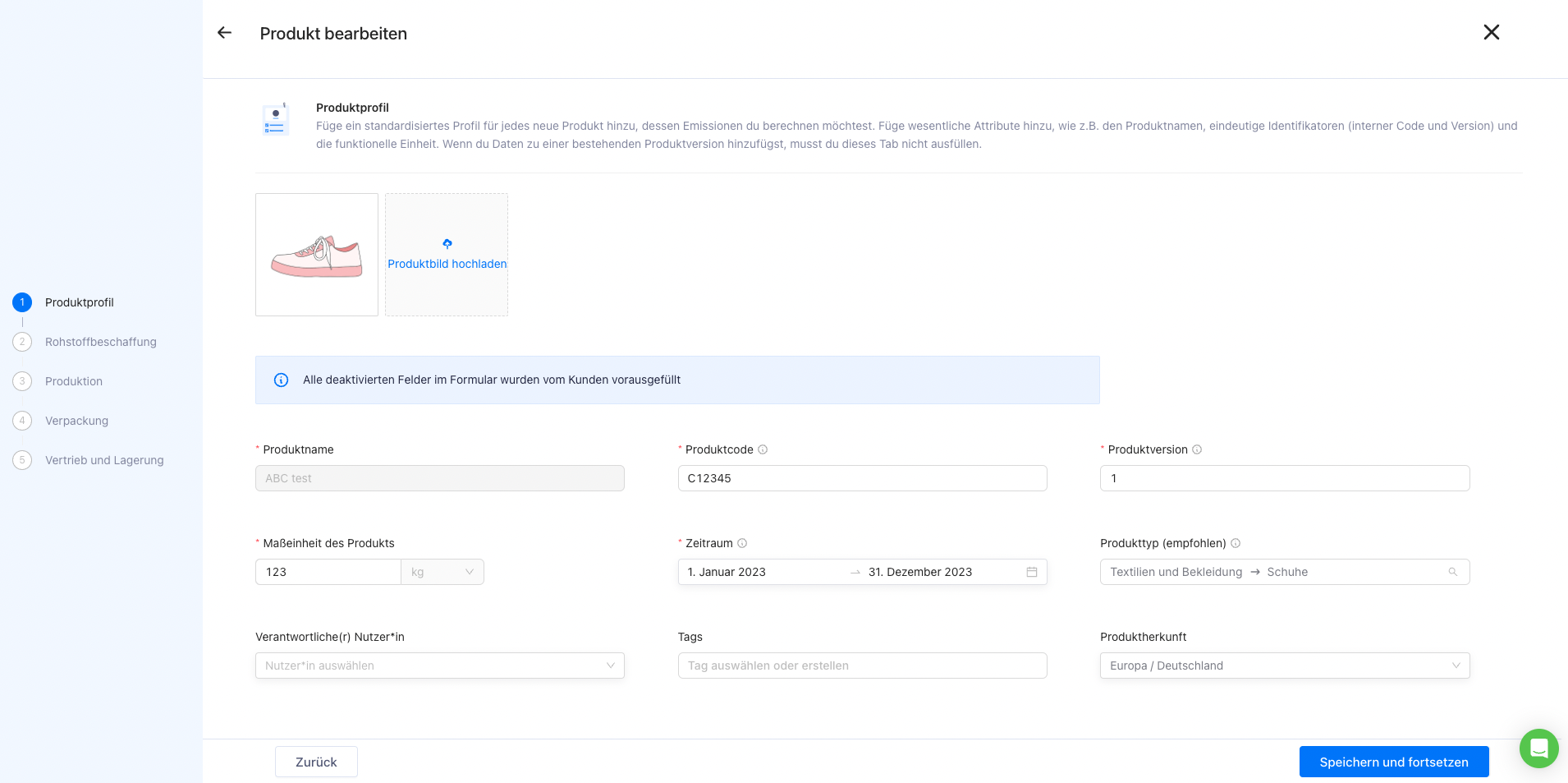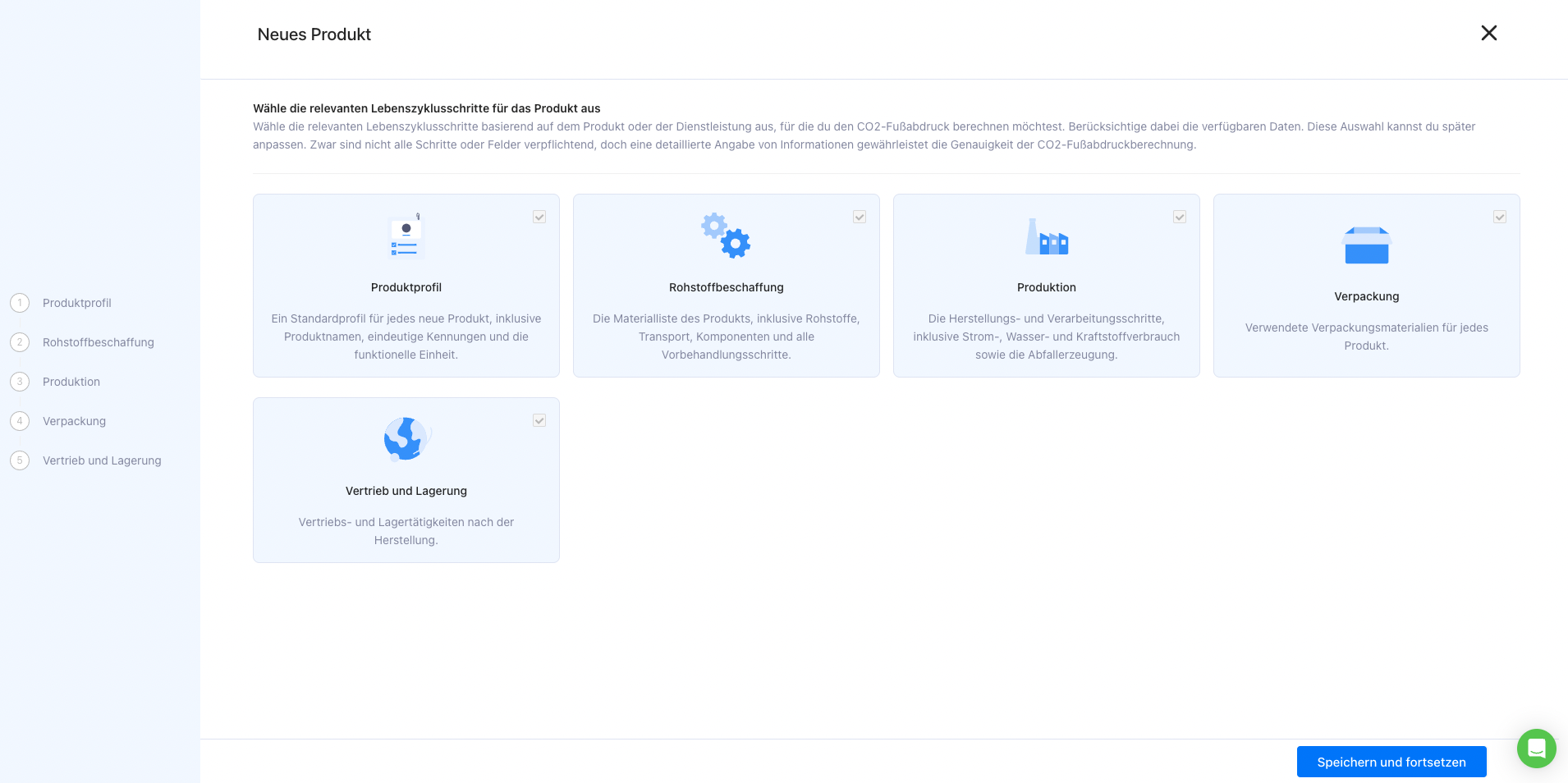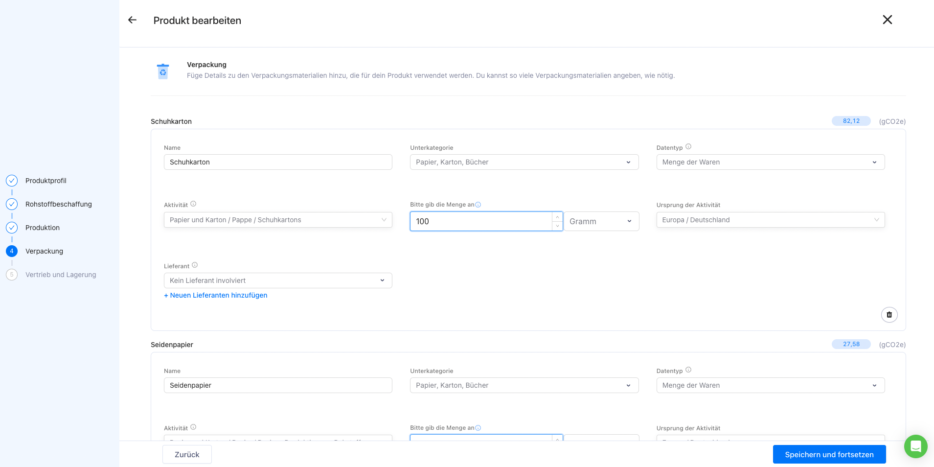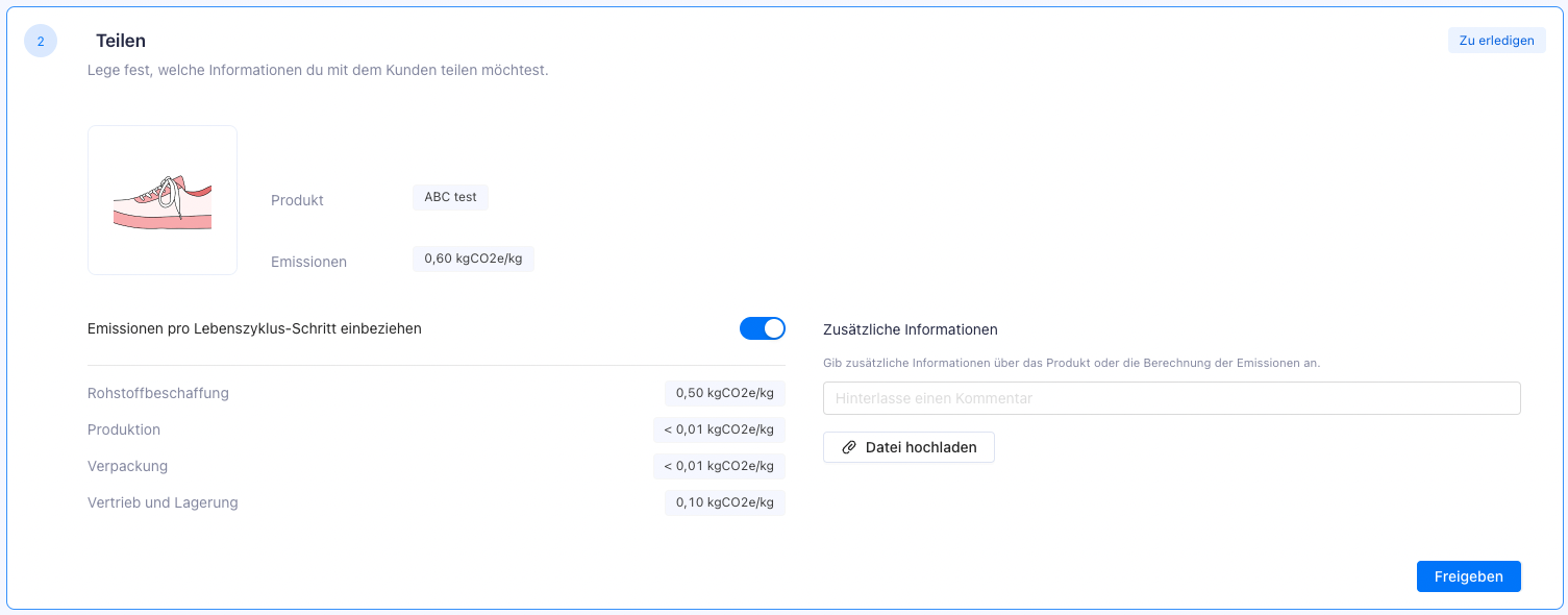 Nachdem Sie alle erforderlichen Daten eingegeben haben, klicken Sie auf „Speichern und fortsetzen“. Sie werden dann zur Startseite weitergeleitet, wo Sie einen Überblick über den Fußabdruck Ihres Produkts sehen können.