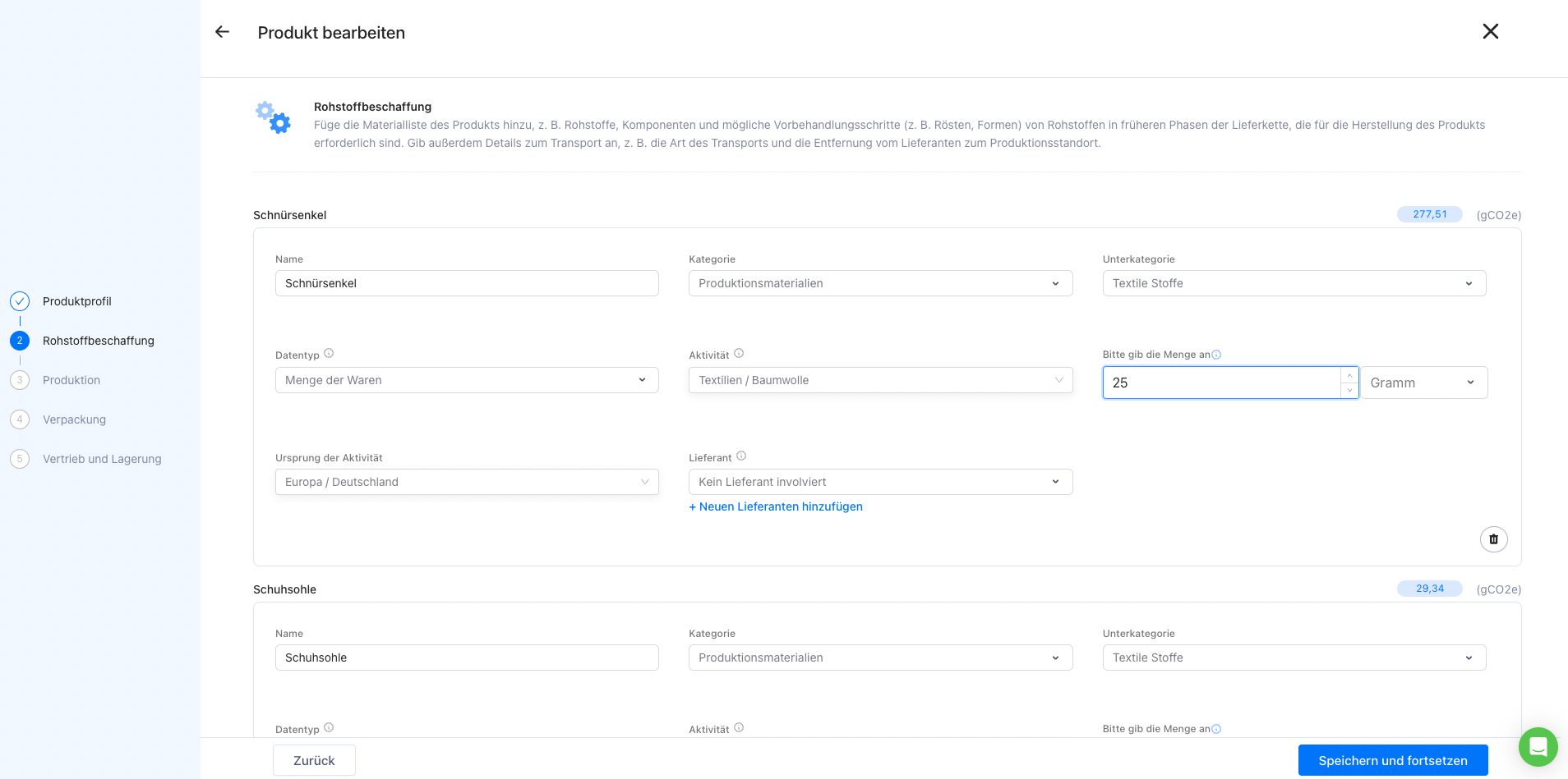 Der nächste Abschnitt befasst sich mit der Beschaffung von Rohstoffen und der Logistik. Hier geben Sie die Rohstoffe ein, die zur Herstellung des Produkts benötigt werden, sowie die Transportinformationen für deren Beschaffung oder Informationen zu deren Eingangslogistik.