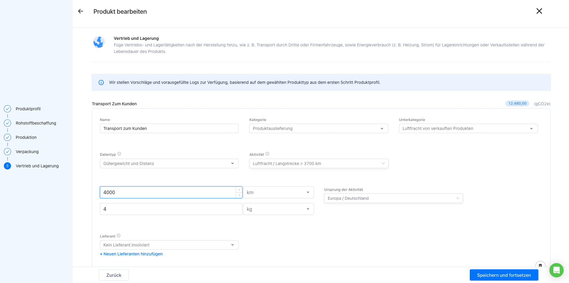 Hier können Sie den Transport zum Kunden nach der Herstellung sowie die Lagertätigkeiten hinzufügen. Dies umfasst Transport durch Dritte oder Firmenfahrzeuge, sowie den Energieverbrauch (z. B. Heizung, Strom) für Lagereinrichtungen.