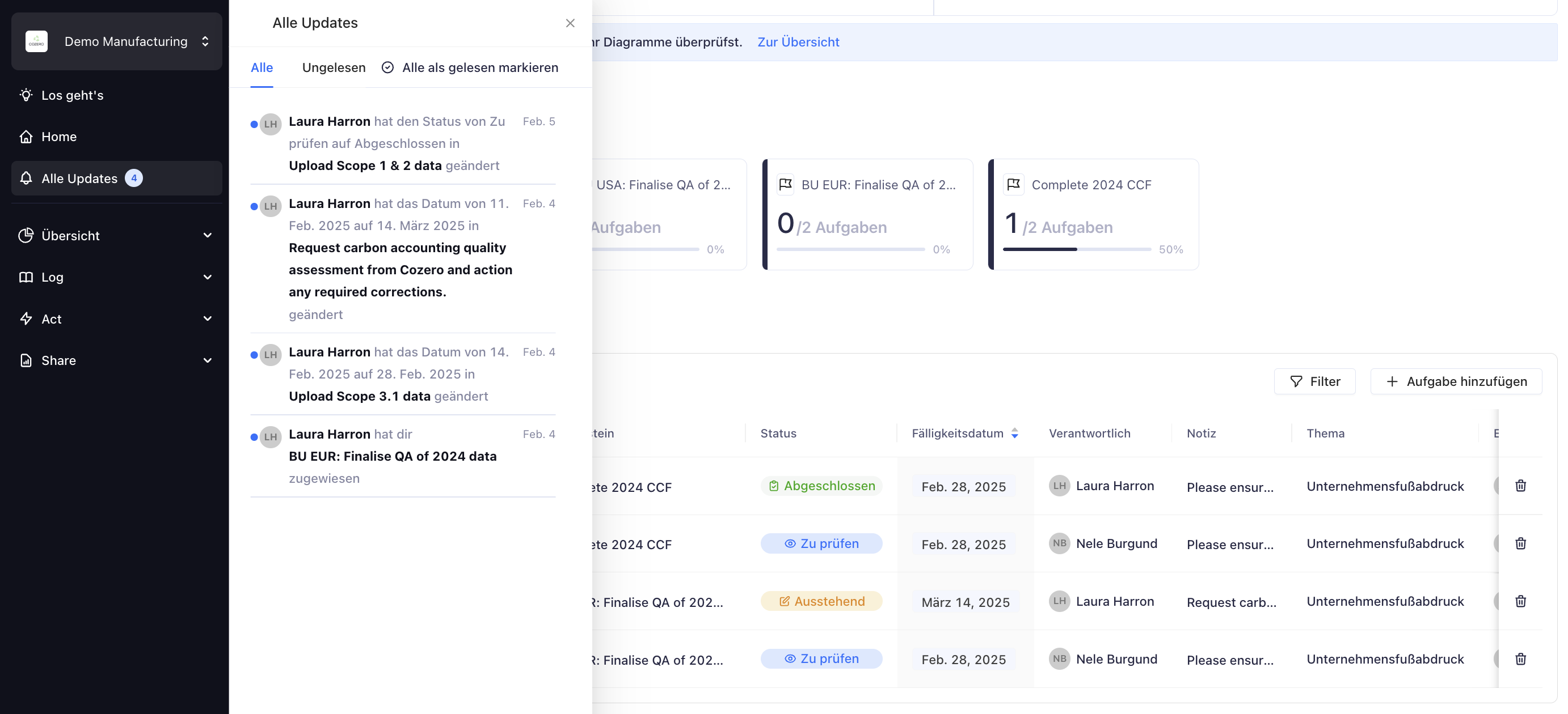 Der Cozero Aufgabenmanager: Speziell für Nachhaltigkeitsteams entwickelt, ermöglicht er die nahtlose Zuweisung von Datenerfassungsaufgaben, Fortschrittsverfolgung und stellt die Einhaltung des 4-Augen-Prinzips zur Datenqualität sicher.