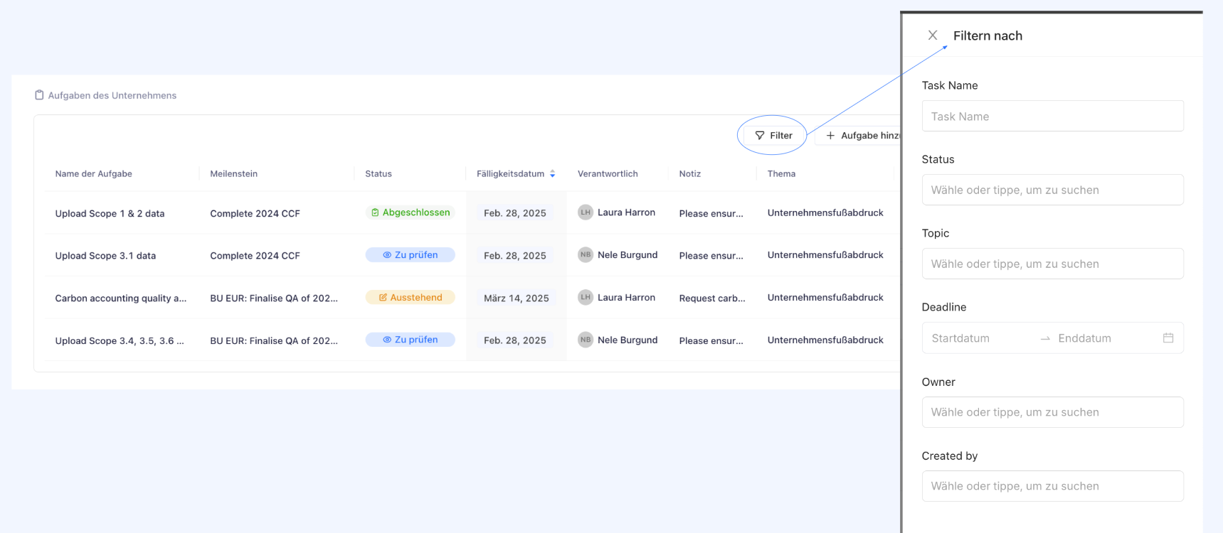 Entwickelt für dezentrale Organisationen: Der Aufgabenmanager ermöglicht es Nachhaltigkeitsmanagern, Aufgaben an Datensammler zuzuweisen, Fristen zu verwalten und die Informationsweitergabe zu verbessern. Nutze den Aufgabenmanager, um Unternehmensmeilensteine zu erreichen, und verwende den Statusbereich zur Umsetzung des 4-Augen-Prinzips in deinen Emissionsberechnungen.