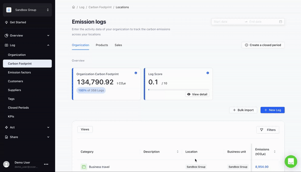 Cozero Logs are intended to be used as records of emissions for a determined time period and a location (which can be physical or representative of a department or business unit), or a product. Logs are associated with a single Cozero emission category (e.g. Business Travel or Electricity Purchase), which is selected as the first step to entering data in Cozero. It is not possible to create a log for more than one emission category at once.