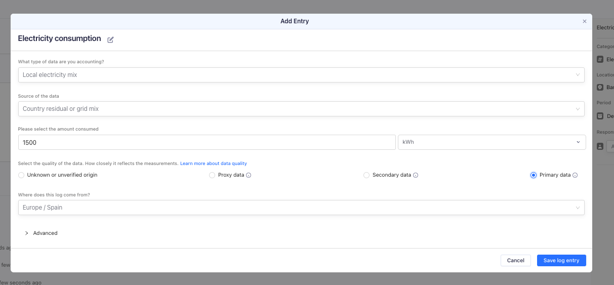 Data quality is a qualifier you can add to your log entries to track whether the source of this data is reliable and has access to the specificities of the activities you’re assessing. This is used to ensure that your Corporate Carbon Footprint is calculated based on relevant data, and it is required by diverse reporting frameworks, including the CSRD.