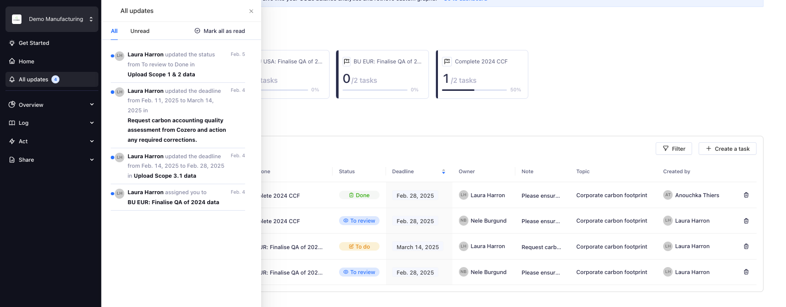 Our new home section enhances data visibility, task management, and high-level company footprint data for all users. This feature includes a task manager and notification center, addressing user demand and supporting our 4-eye principle tool.