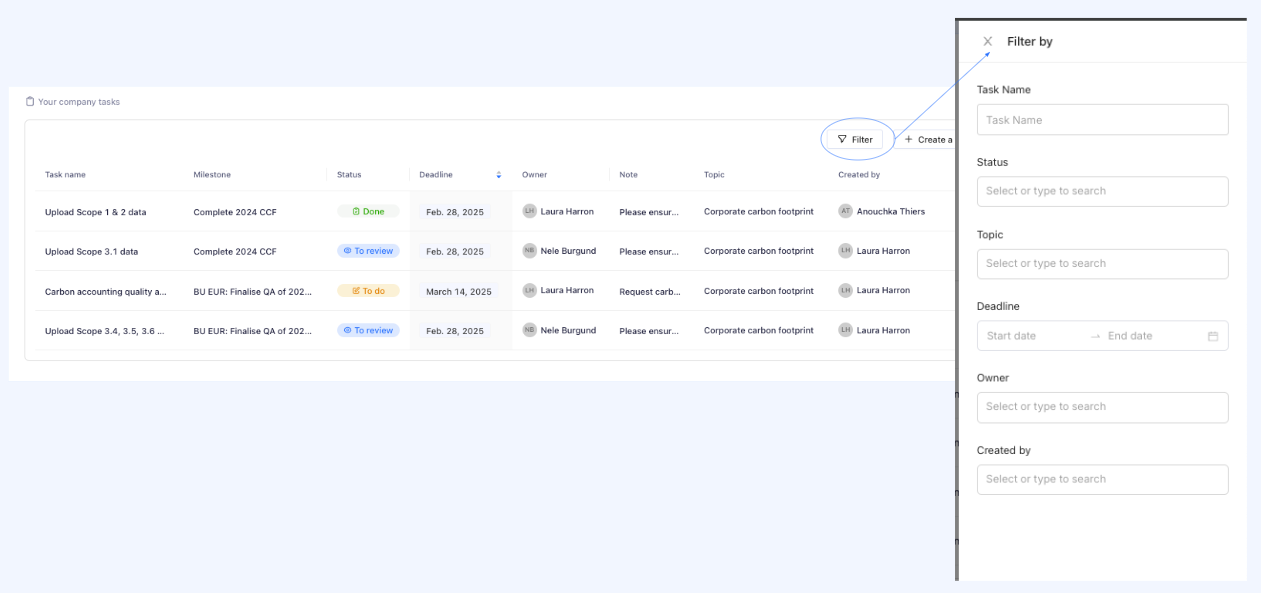 Designed for decentralized organizations, the task manager allows sustainability managers to assign tasks to data collectors, managing timelines and ensuring increases information sharing. Leverage the task manager to achieve your company milestones, and use the Status section to implement four-eye principles in your emissions calculations. The task manager supports transparency and clarity in data collection and review process, supporting better decision-making based on quality data insights. -