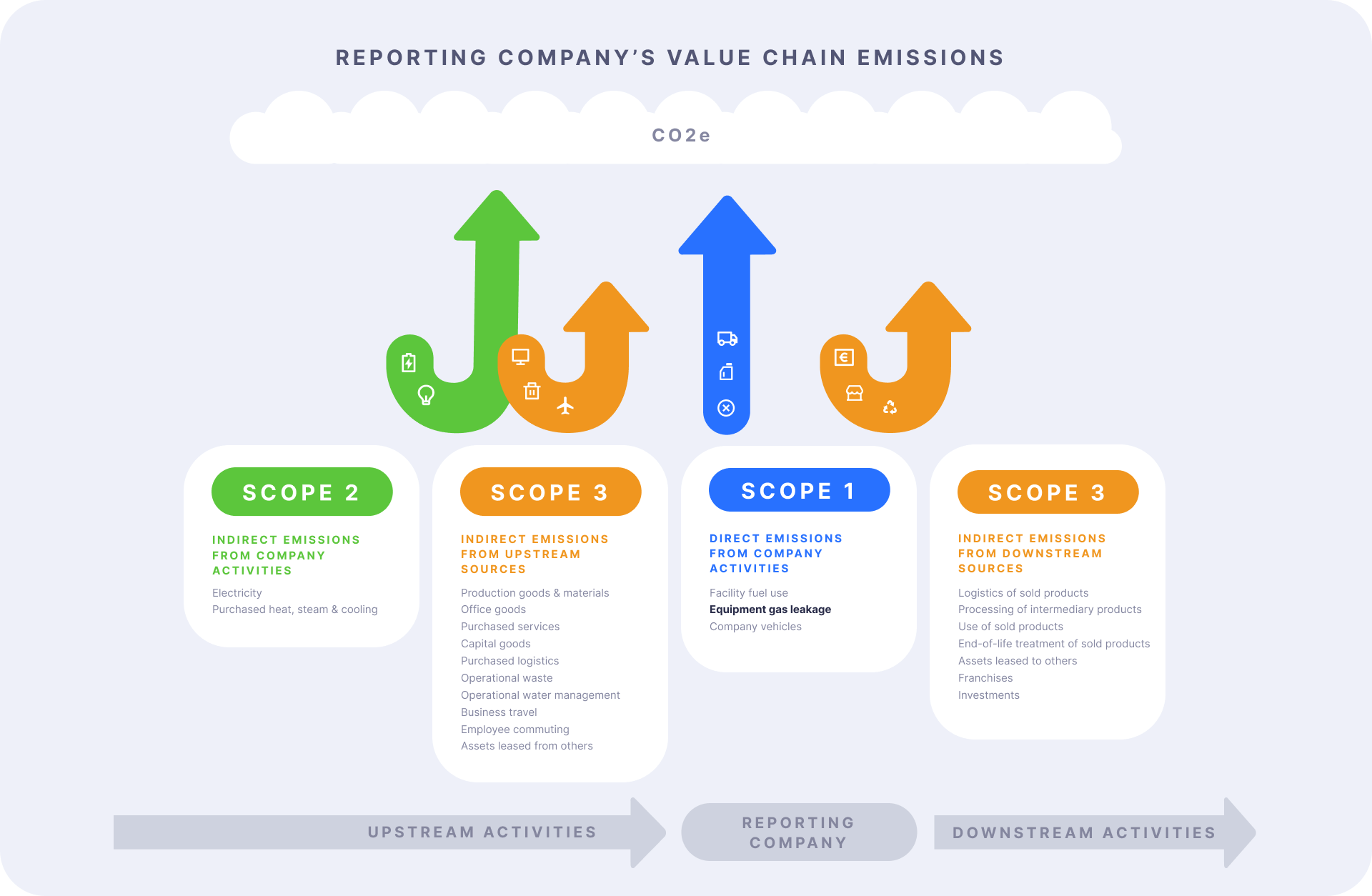 The GHG Protocol Corporate Standard is an internationally-recognized go-to standard for estimating and reporting corporate GHG emissions. GHG emissions are categorized into three Scopes. For further information see here.
