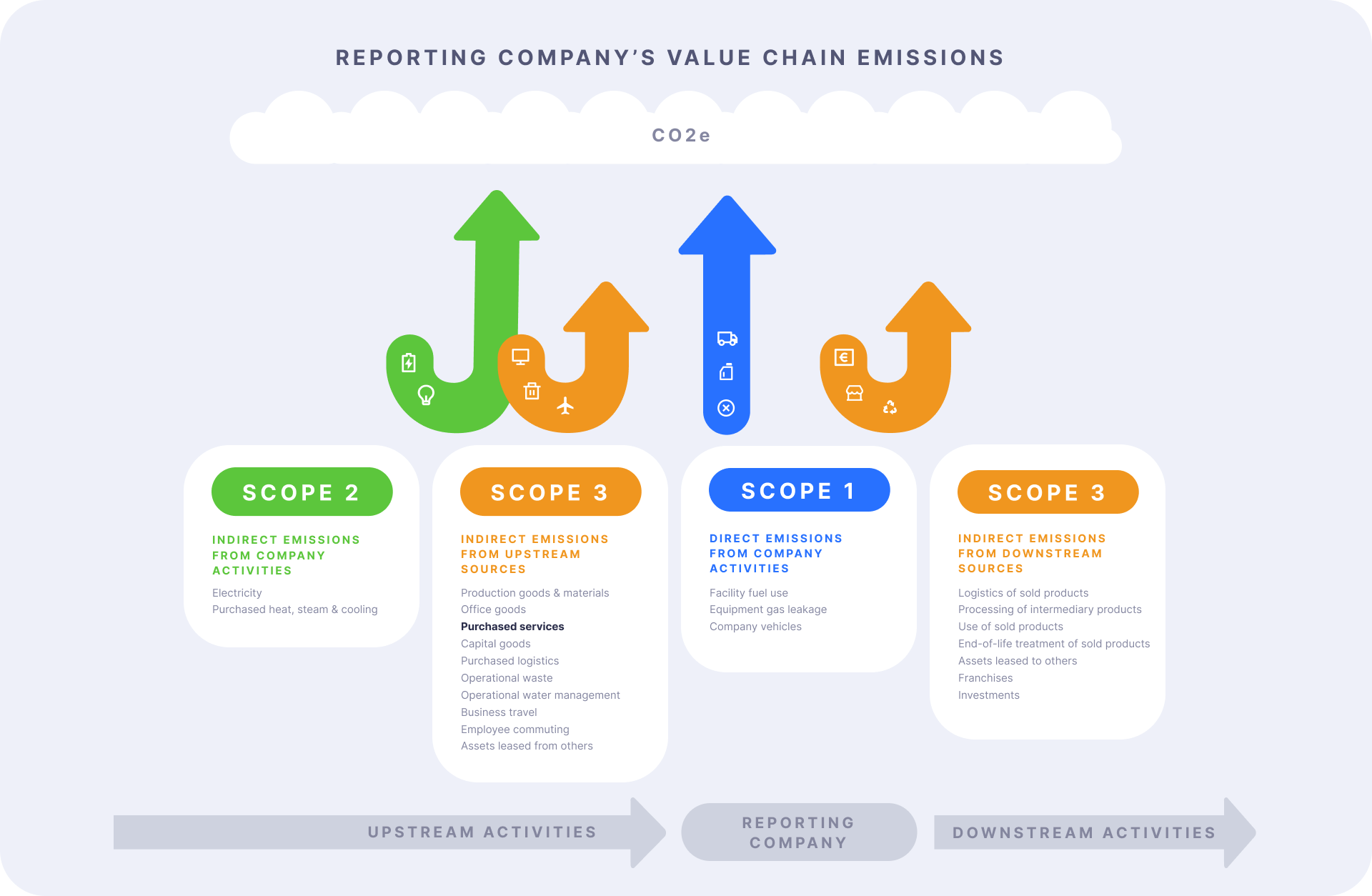 The Cozero category, Purchased services, is an upstream source of scope 3 emissions, as defined by the GHG Protocol. All emission calculation methodologies follow the requirements for this scope of emission accounting.