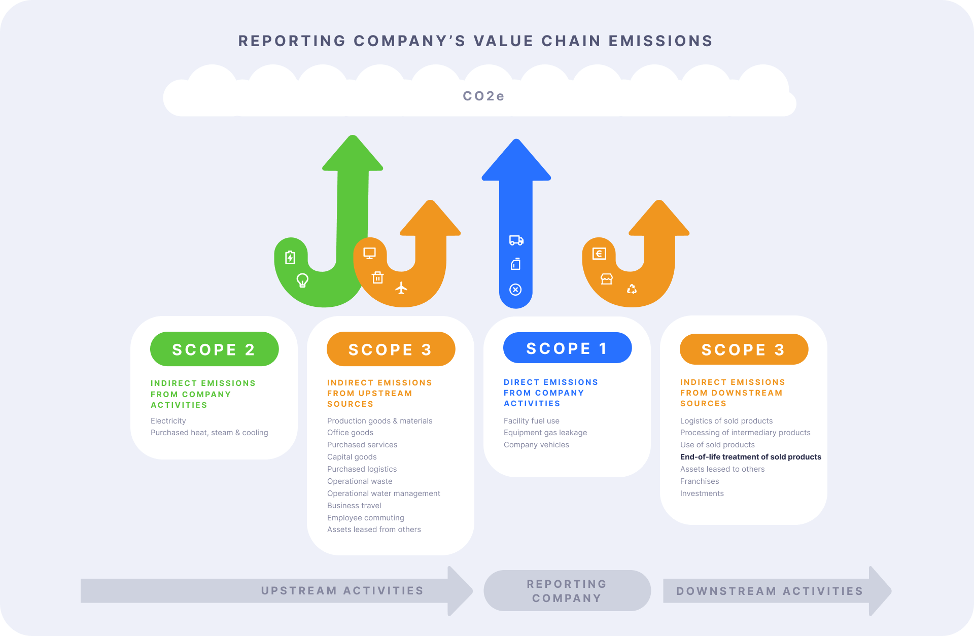 Scope 3 emissions are all indirect emissions – not included in scope 2 – that occur in the value chain of the reporting company, including both upstream and downstream emissions. In other words, emissions that are linked to the company’s operations. Activities covered by scope 3 emissions are diverse, but sit in two high level categories; upstream emissions related to purchased or acquired goods and services, and downstream emissions related predominantly to the sales of goods and services.