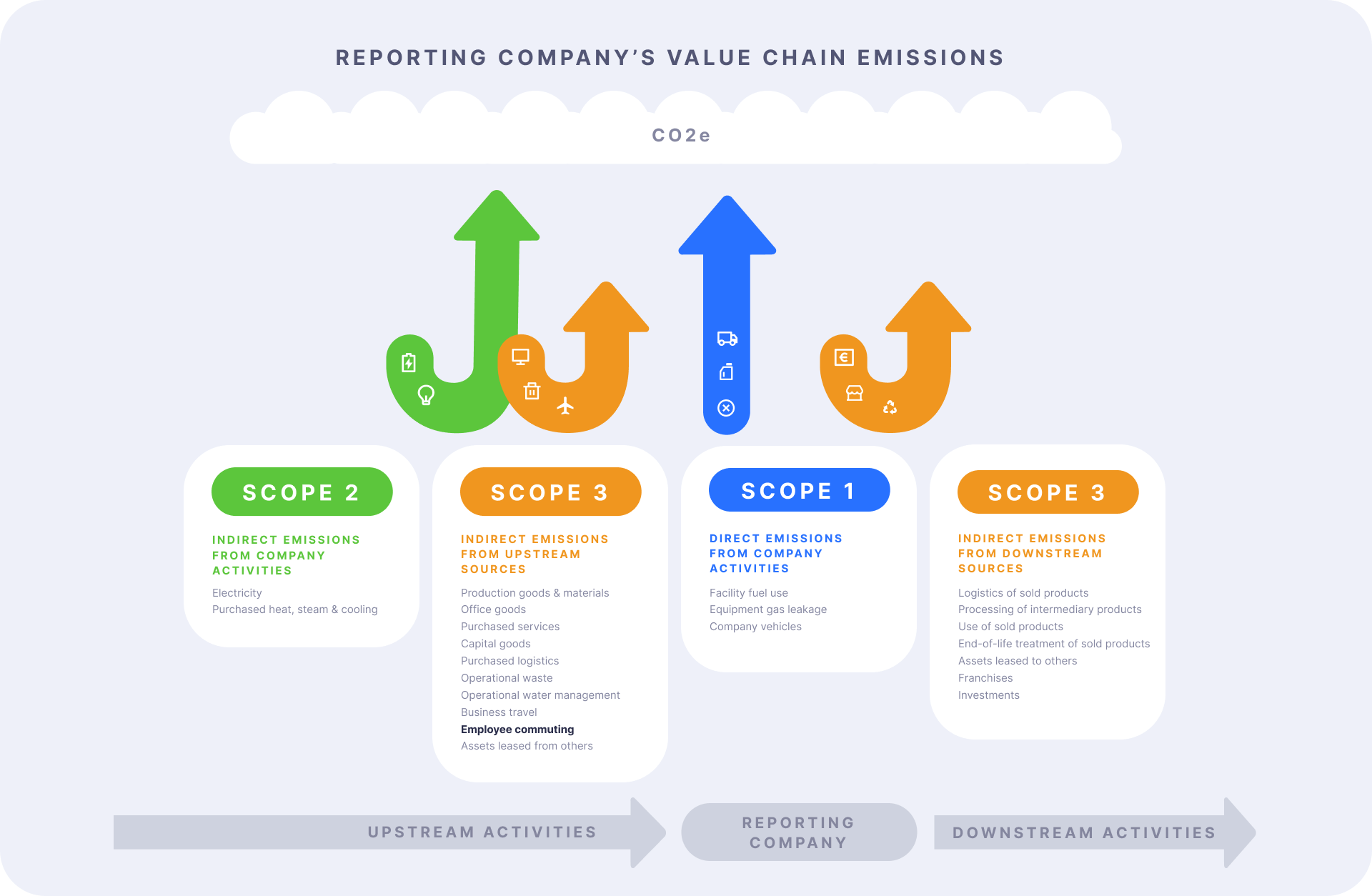 Scope 3 emissions are all indirect emissions – not included in scope 2 – that occur in the value chain of the reporting company. In other words, the emissions that are linked to the company’s operations. Activities covered by scope 3 emissions are diverse, but sit in two high level categories: