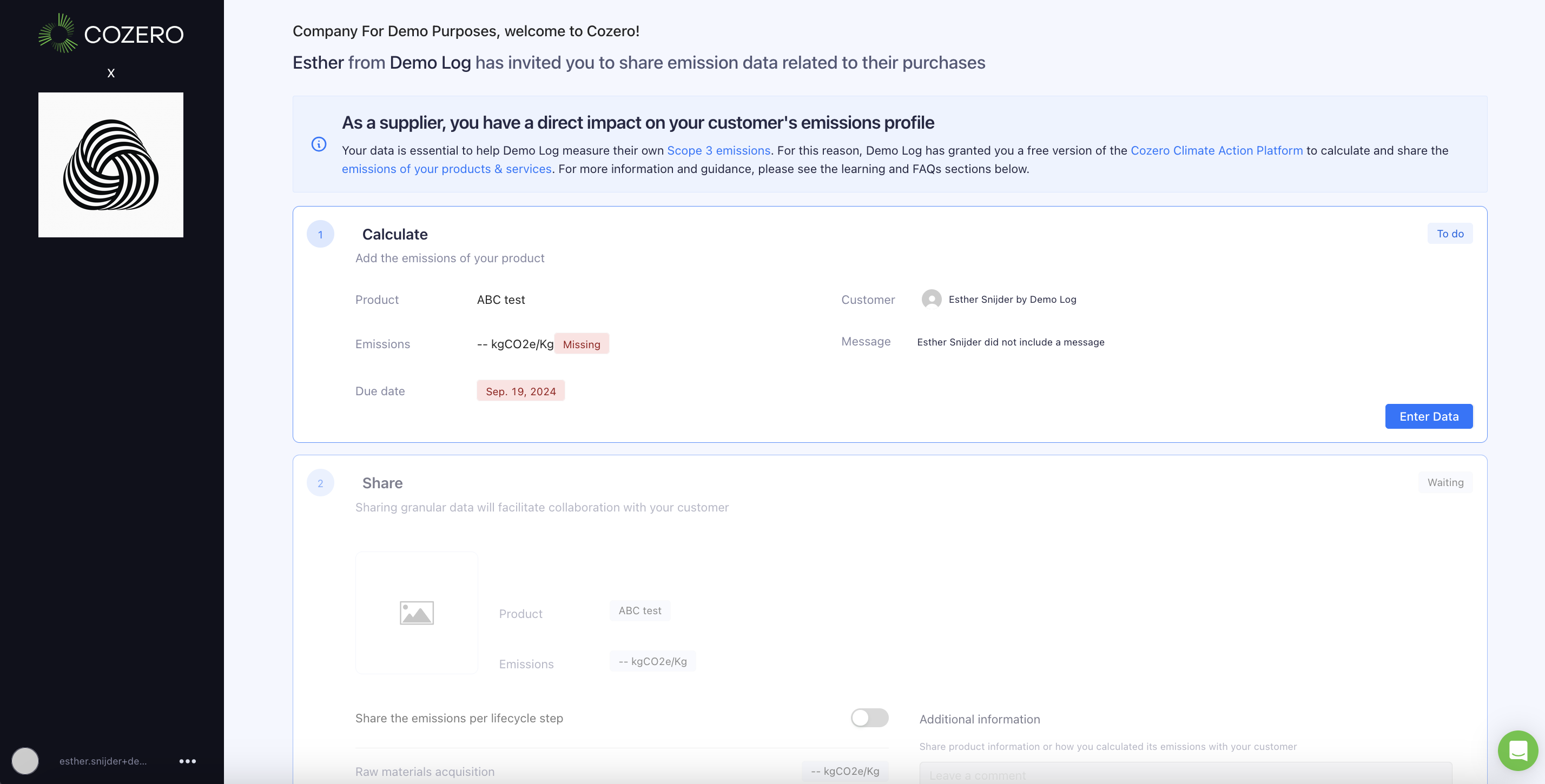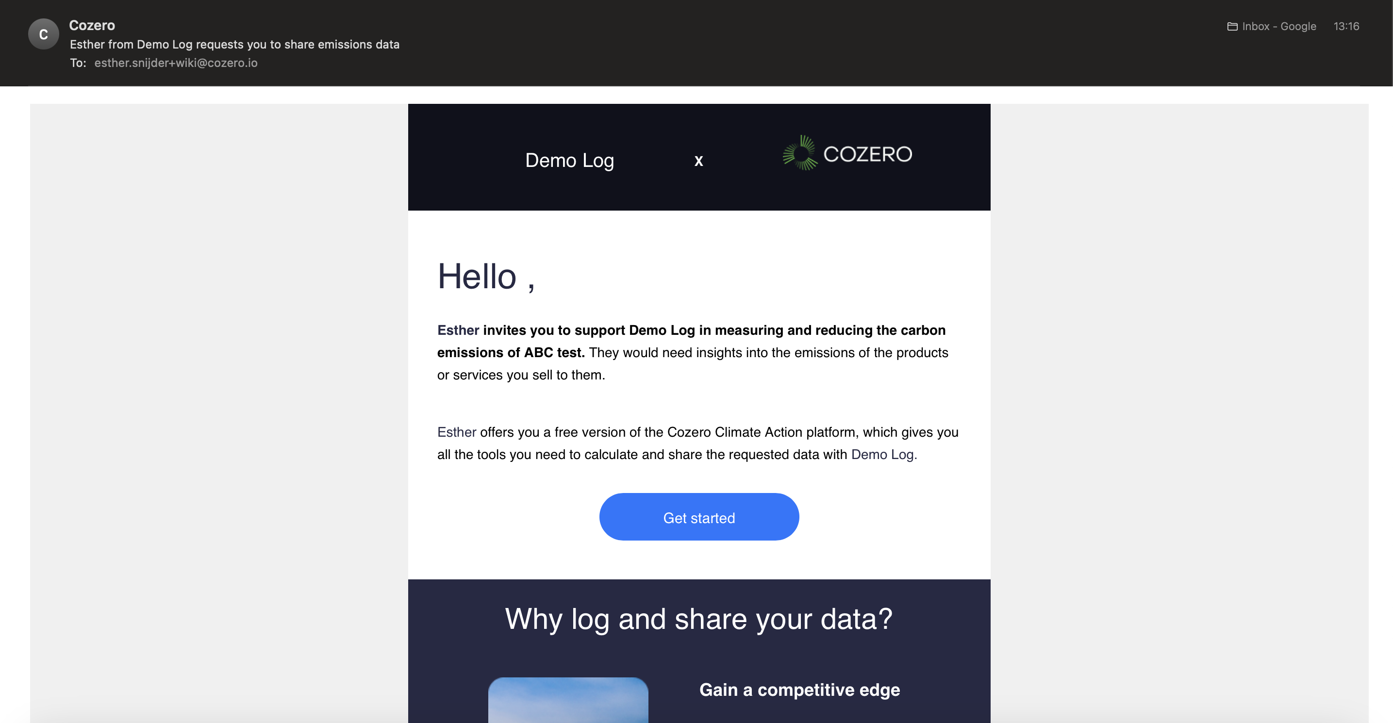 Your customer has invited you to access a free version of the Cozero Climate Action platform. Click the ‘Get Started’ button in the invitation email to begin.