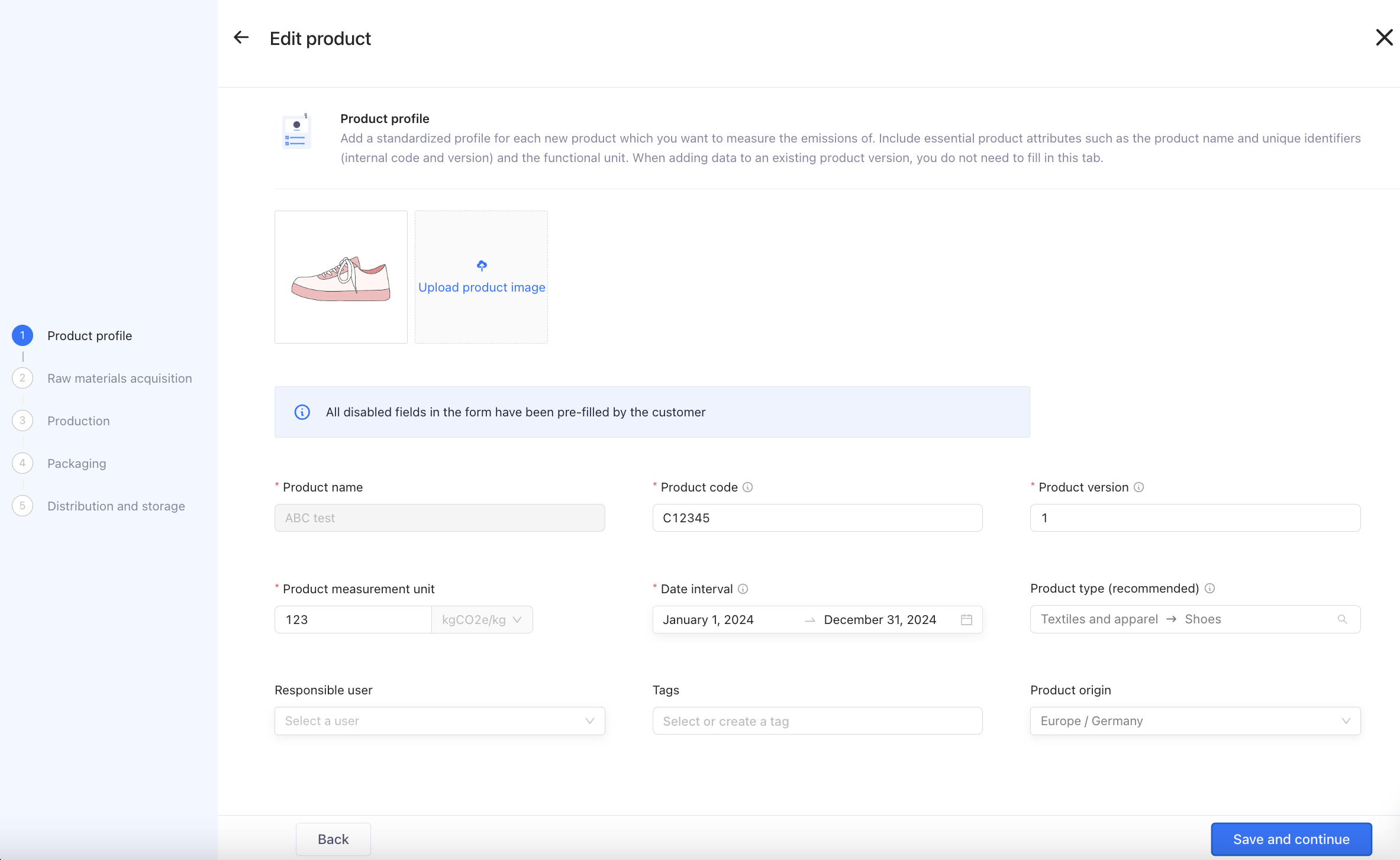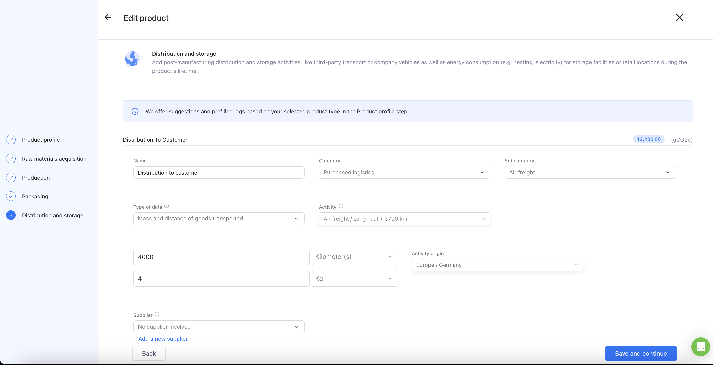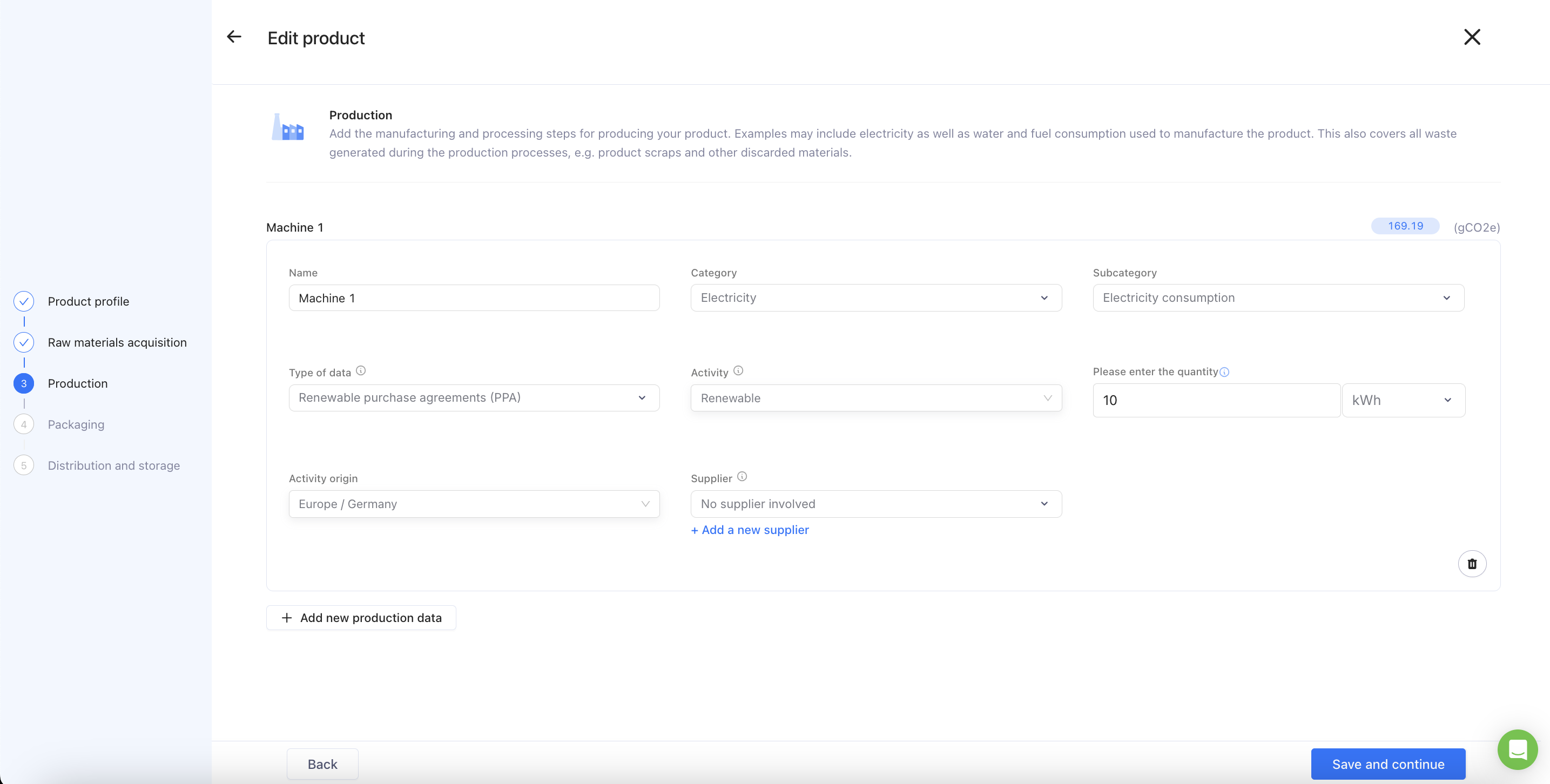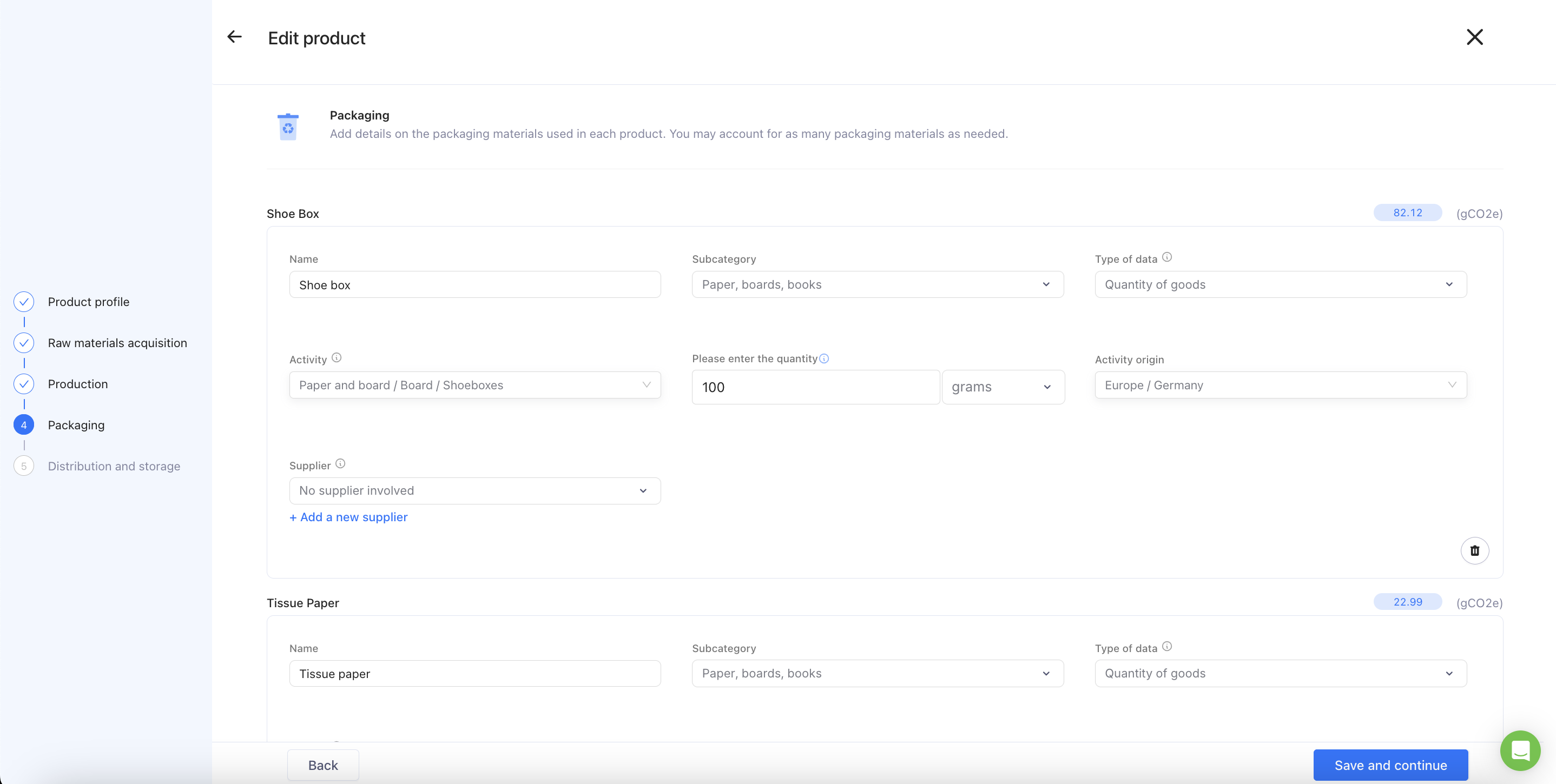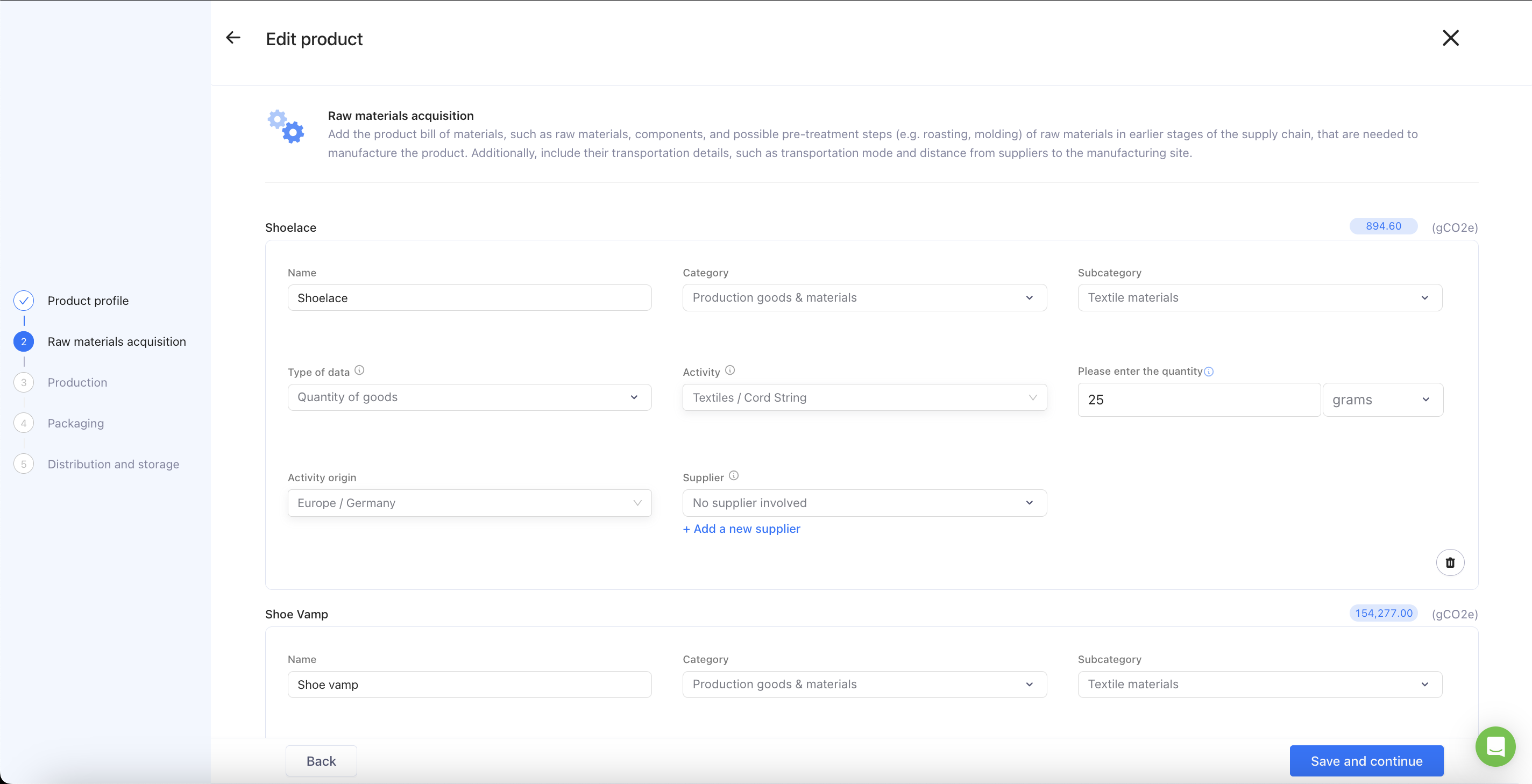 After completing all the necessary data, click ‘Save and Continue.’ You will then be redirected to the homepage, where you can scroll down to view an overview of your product's footprint.
