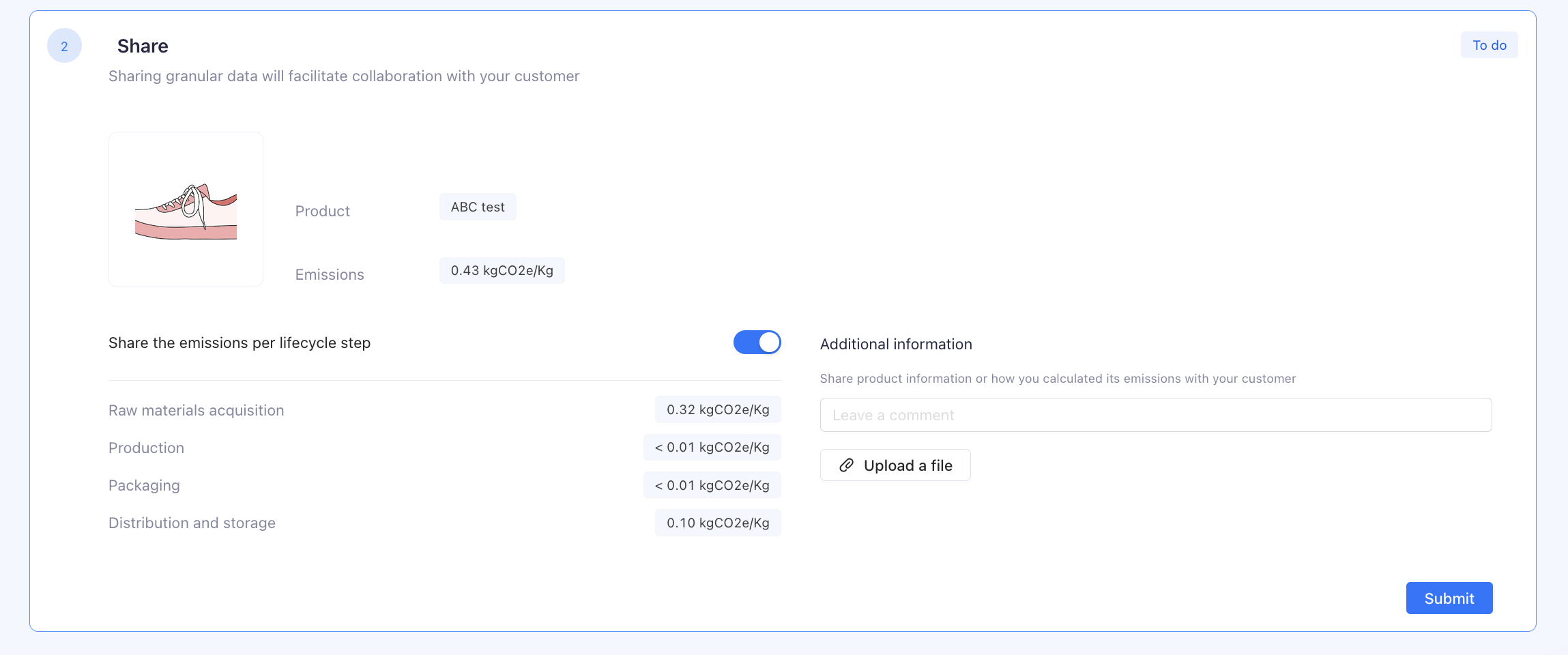 When a supplier submits an emission factor request, the status now updates to “Submitted”. This change ensures that the interface reflects the supplier’s perspective. Previously, the status appeared as “To review” for both customers and suppliers—even when no action was required from the supplier.
